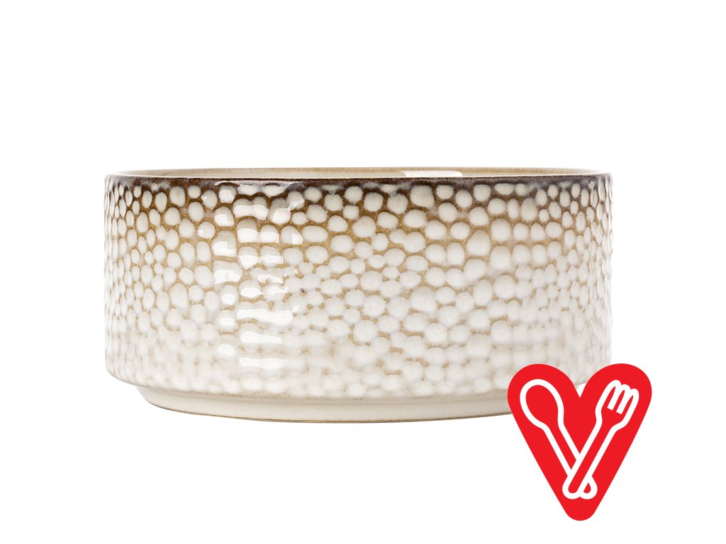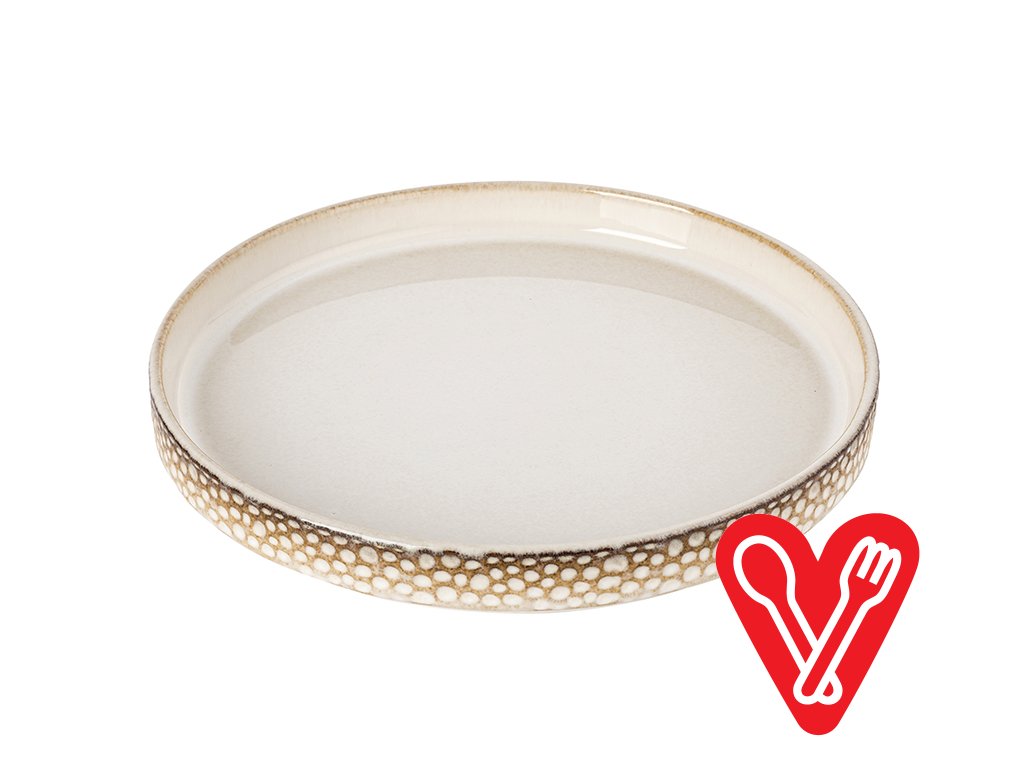 Štýlová 18-dielna porcelánová sada riadu Gambia v krémovej farbe, zdobená reliéfom drobných oblých jamôčok. Elegantná, pevná, vhodná do umývačky aj mikrovlnnej rúry – ideálna pre každú modernú domácnosť.