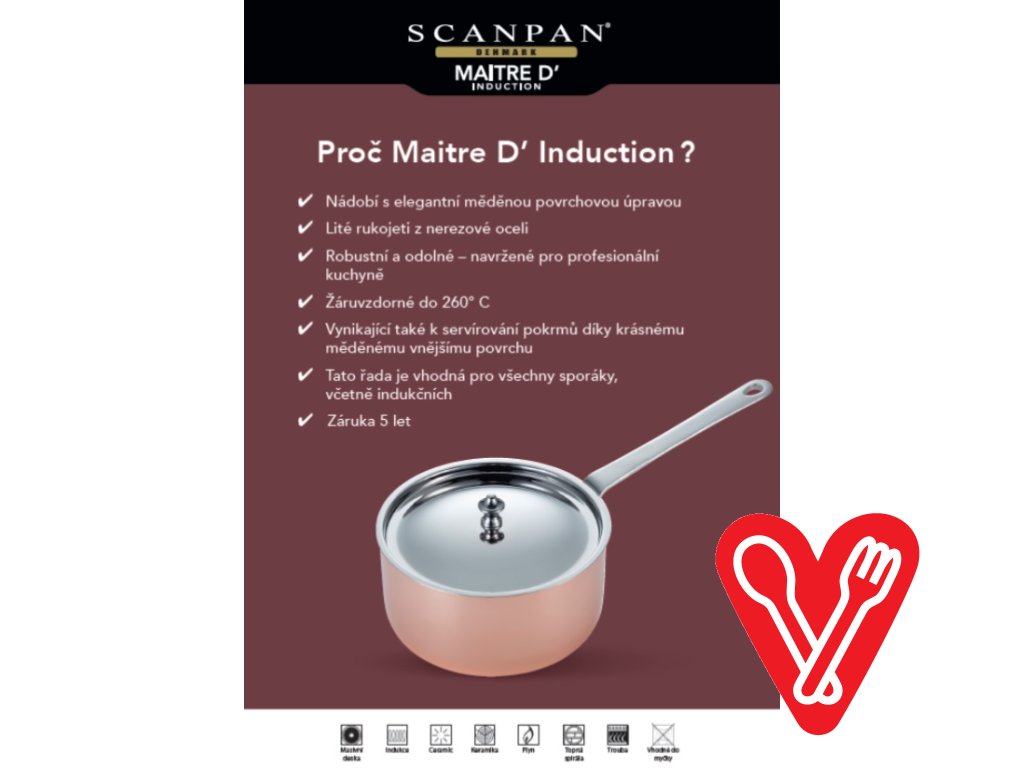 Medená panvica hlboká Scanpan z kolekcie Maitre D´ je vyrobená kombináciou troch materiálov. Vonkajšia vrstva je zložená z medi, ktorá jej dodáva elegantný vzhľad a nestarnúci dizajn, strednú vrstvu tvorí hliník, ktorý zabezpečuje rovnomernú distribúciu tepla po celej ploche nádoby a vnútro panvice je vyrobené z vysoko kvalitnej nehrdzavejúcej ocele (kvalita 18/10).