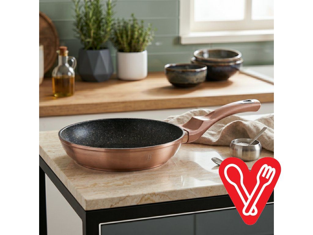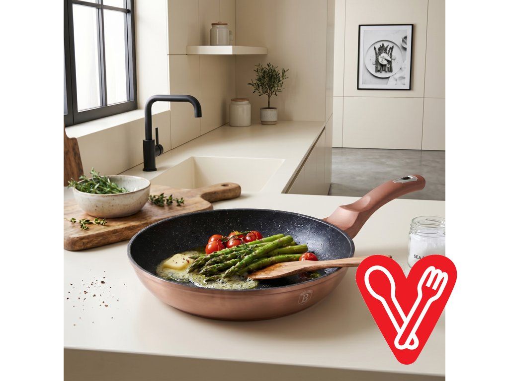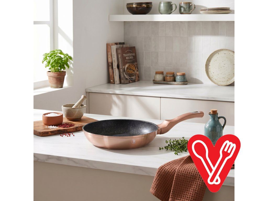 Elegantná nepriľnavá panvica Rose Gold s priemerom 28 cm, vhodná na všetky typy varičov vrátane indukcie. Turbo indukčné dno, ECO-friendly zloženie a jednoduchá údržba.