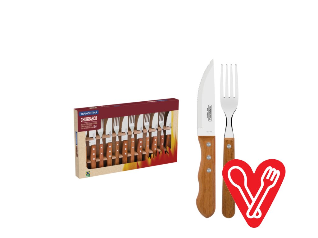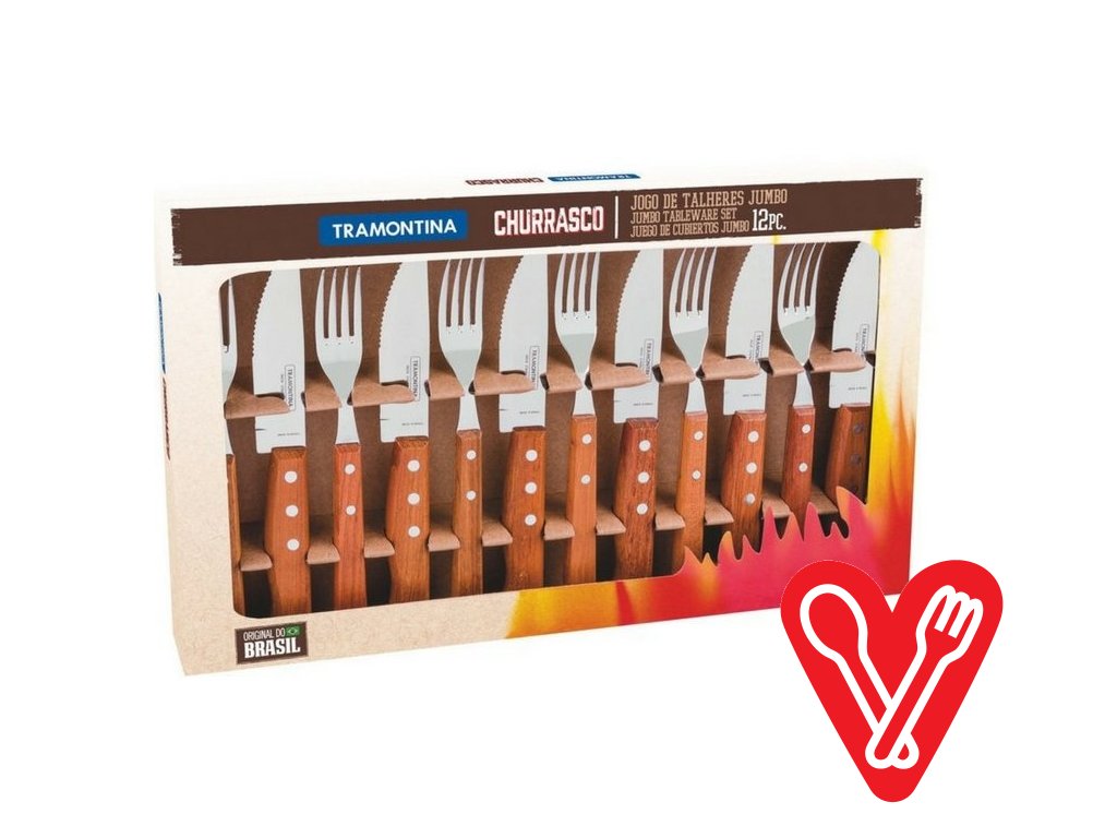 Barbecue príborový set Jumbo zložený z 12 kusov zo série Dynamic z dielne brazílskej značky Tramontina pozostáva z vidličiek a steakových nožov. Široká čepeľ noža je vyrobená z tepelne upravenej nehrdzavejúcej ocele, vďaka čomu je jeho rezná hrana dlhodobo ostrá. Rukoväte sú vyrobené z prírodného dreva a sú pripevnené hliníkovými nitmi. Príborový set je špeciálne navrhnutý pre pohodlné rezanie steakov a iných druhov mäsa, takže ho určite oceníte Vy aj Vaši hostia na záhradných grilovačkách. Dizajn jednotlivých produktov dodá Vášmu stolovaniu rustikálny vzhľad. Odporúčame ručné umývanie, nevhodné do umývačky riadu. Balené v darčekovom balení.