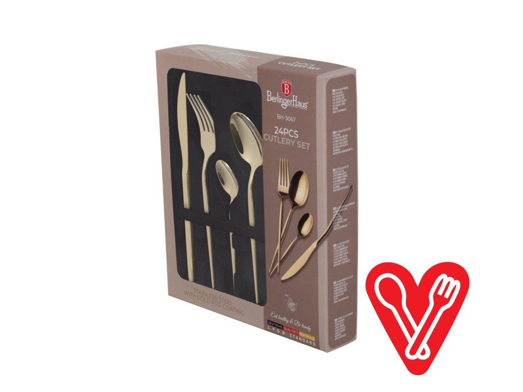 24-dielna sada príborov BerlingerHaus Champagne je navrhnutá tak, aby dokonale doplnila moderné aj tradičné prestieranie. Jej minimalistické línie, ladný tvar a luxusné šampanské prevedenie vytvárajú harmonický a reprezentatívny vzhľad každej sviatočnej či bežnej tabule.