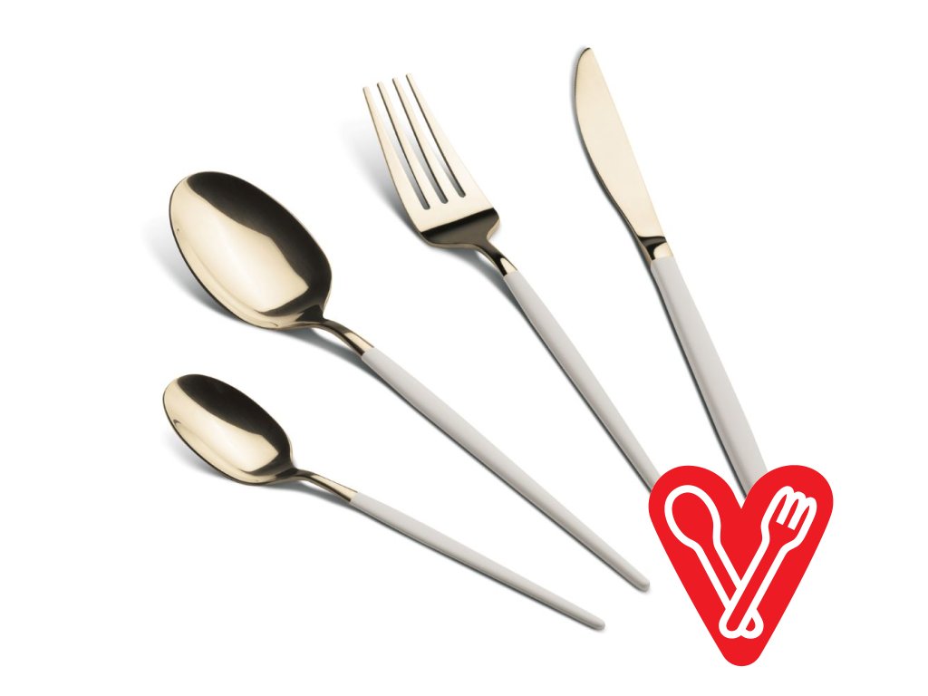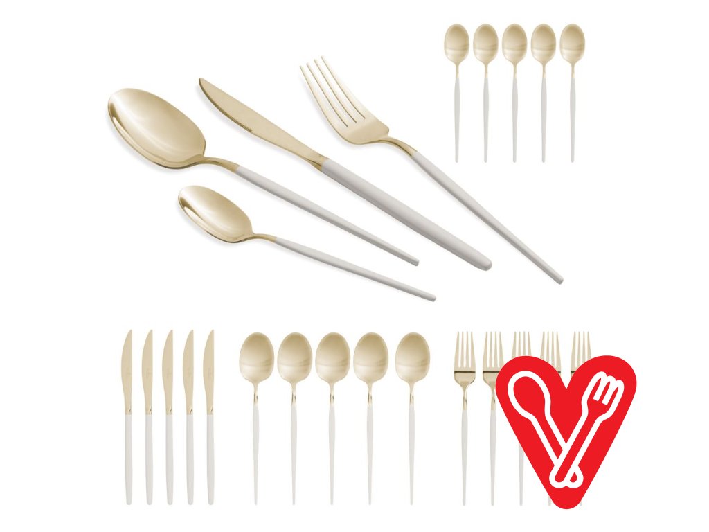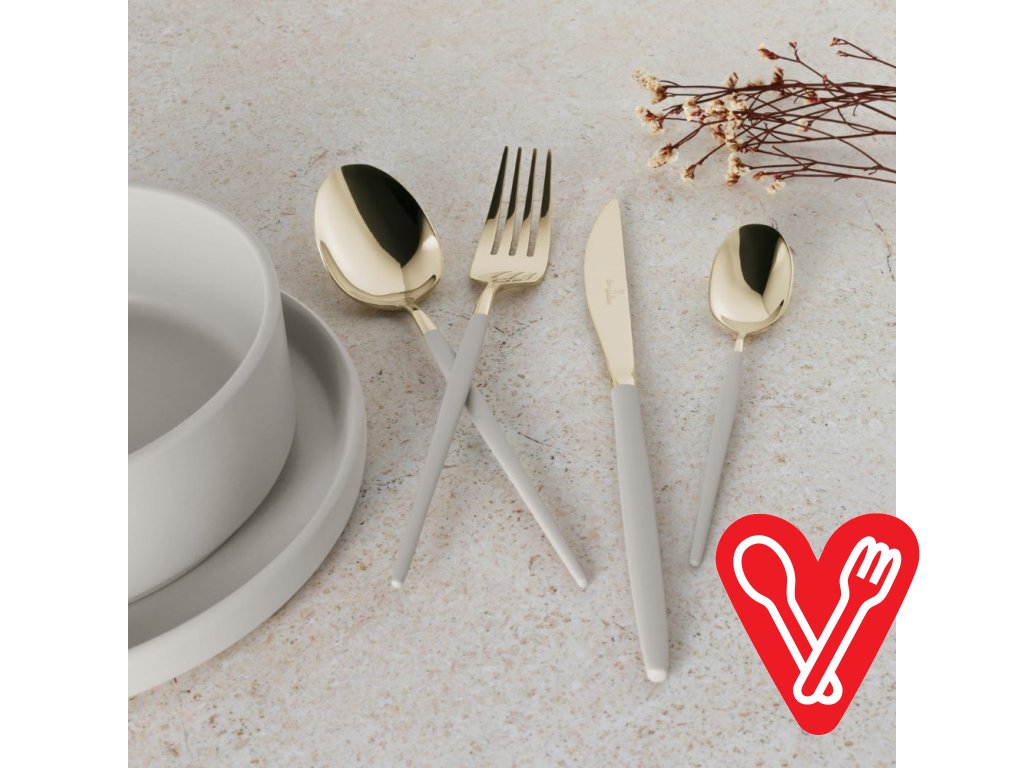 Príbory sú vyrobené z vysoko kvalitnej nehrdzavejúcej ocele, ktorá je pre ešte vyššiu odolnosť doplnená zlatým PVD povlakom. Povrchová úprava Mirror dodáva čepeliam vysoký lesk, zatiaľ čo matné rukoväte vytvárajú elegantný kontrast.