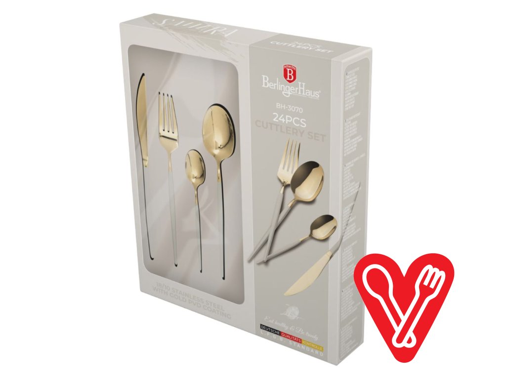 - Elegantná 24-dielna sada príborov BerlingerHaus v krémovo-šampanskom prevedení je vyrobená z nehrdzavejúcej ocele so zlatým PVD povlakom. Kombinuje lesklé čepele s matnými rukoväťami, ponúka pohodlný úchop a dodáva prestretiu nádych luxusu.